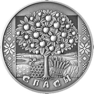 Center: a honeycomb, apple tree, and rye sheaf, symbols of the Honey, Apple, and Bread Feast Days. Flanked by Belarusian national ornament; below, the circumferential inscription: СПАСЫ (SPASY).