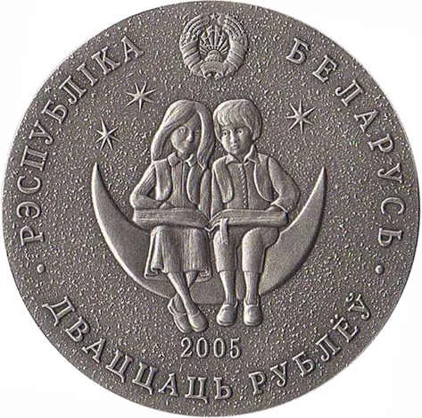 Bottom: relief of the State Coat of Arms. Center: a boy and girl holding an open book against a starry sky. Below: year of issue. Rim inscriptions: top – "РЭСПУБЛIКА БЕЛАРУСЬ", bottom – "ДВАЦЦАЦЬ РУБЛЁЎ".