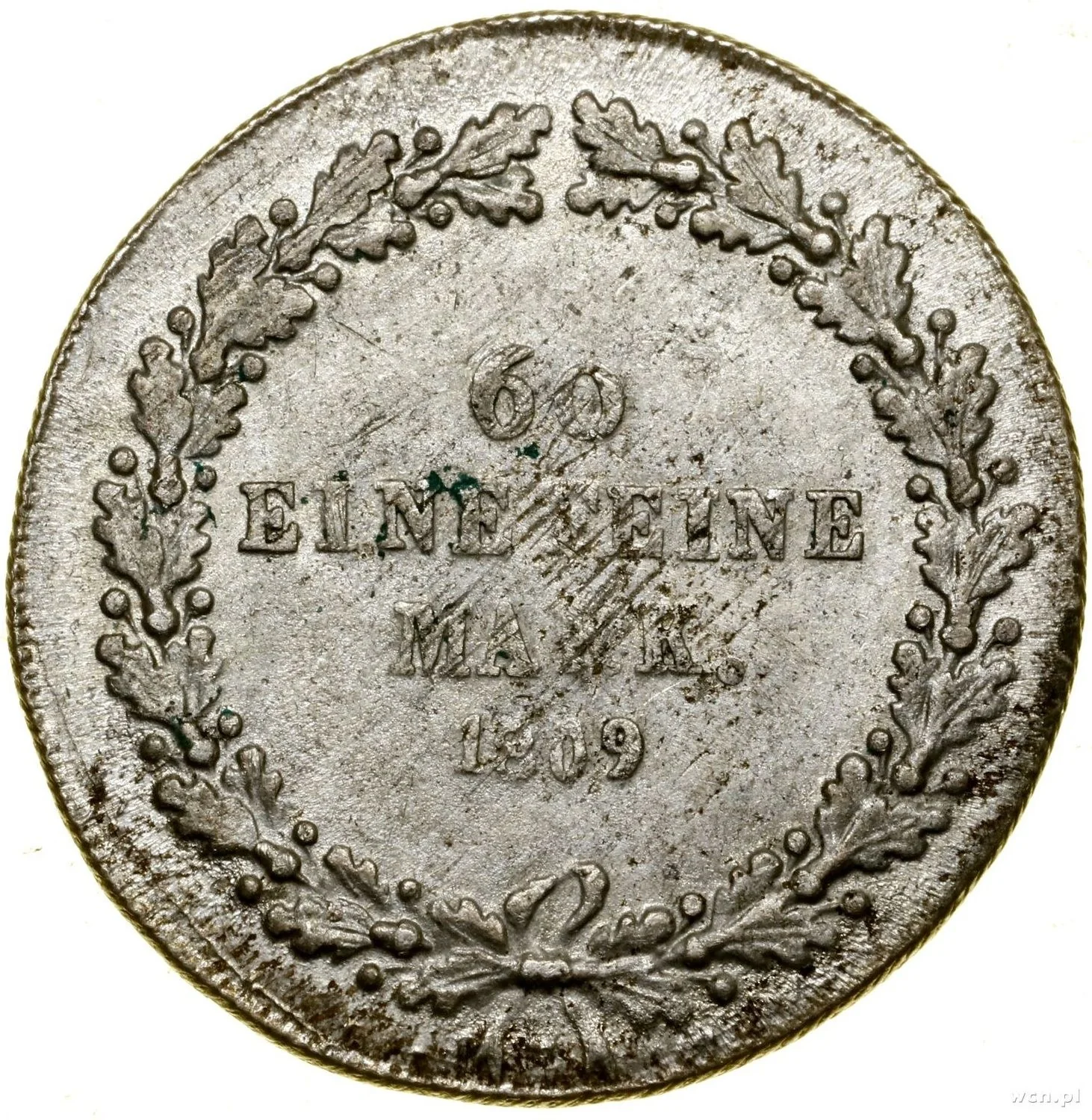 Dated four-line inscription in oak wreath, mint official’s initial below.