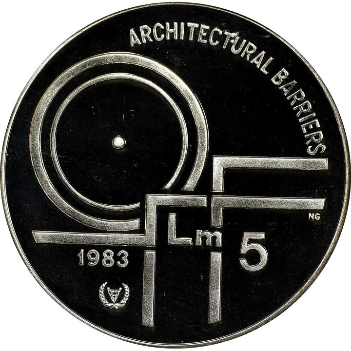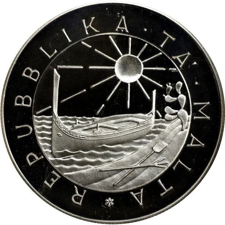 Description: Coat of arms featuring a sunrise over a coastal scene with a Maltese luzzu boat, a shovel, a pitchfork, and an Opuntia plant, encircled by the Republic of Malta's name.
