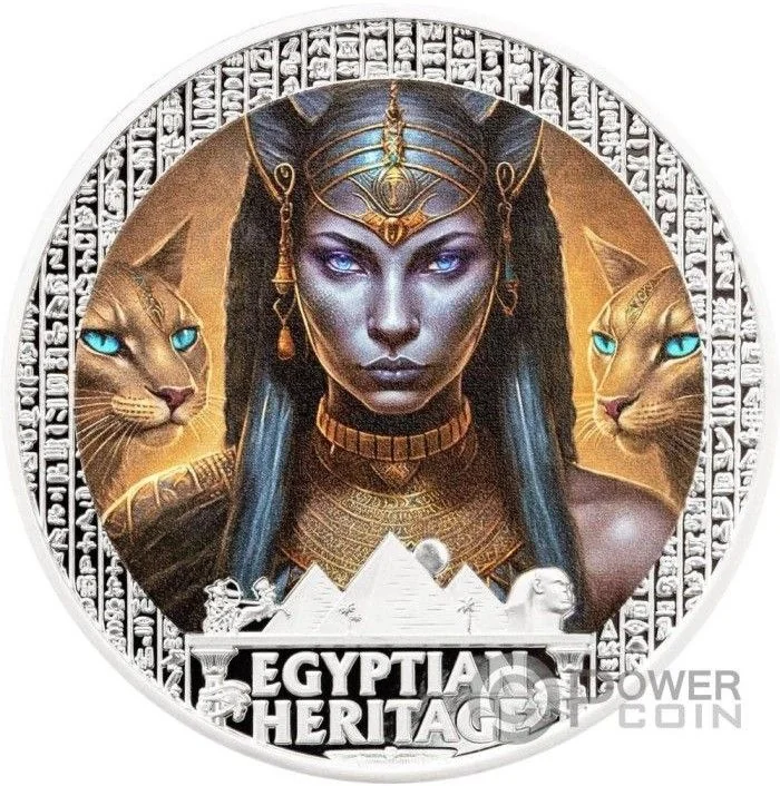 Colourized digital image: Bastet central, Giza pyramids below, hieroglyphics on rim.