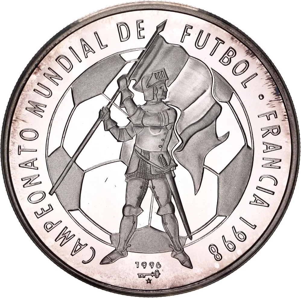 Joan of Arc in armor waves a French flag before a soccer ball. A circular legend bears the event name and date, with the issue date on the exergue.