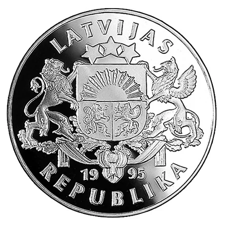 Centered is Latvia's large coat of arms with the year 1995 below. "LATVIJAS" arcs above and "REPUBLIKA" arcs below it.