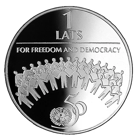 The reverse is split horizontally. The top center features the numeral 1 above "LATS," separated by a line and the phrase "FOR FREEDOM AND DEMOCRACY." Below, the center shows a silhouette of people holding hands above the UN 50th anniversary emblem.