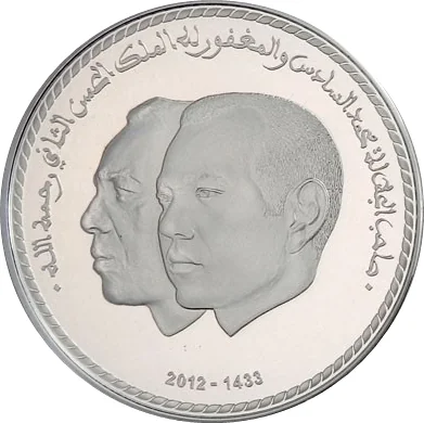 Conjoined portraits of Kings Hassan II and Mohammed VI facing left, with dates below.