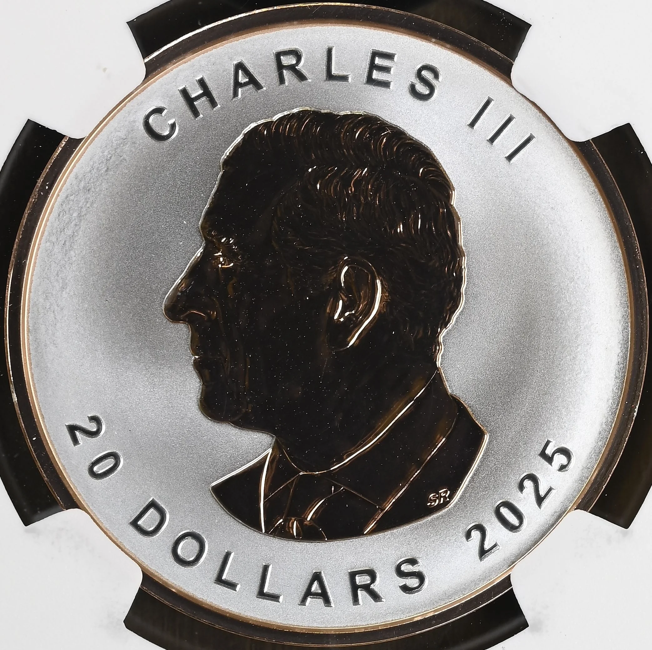 Black rhodium-plated field with a left-facing bust of the 74-year-old King Charles III in a suit and tie.