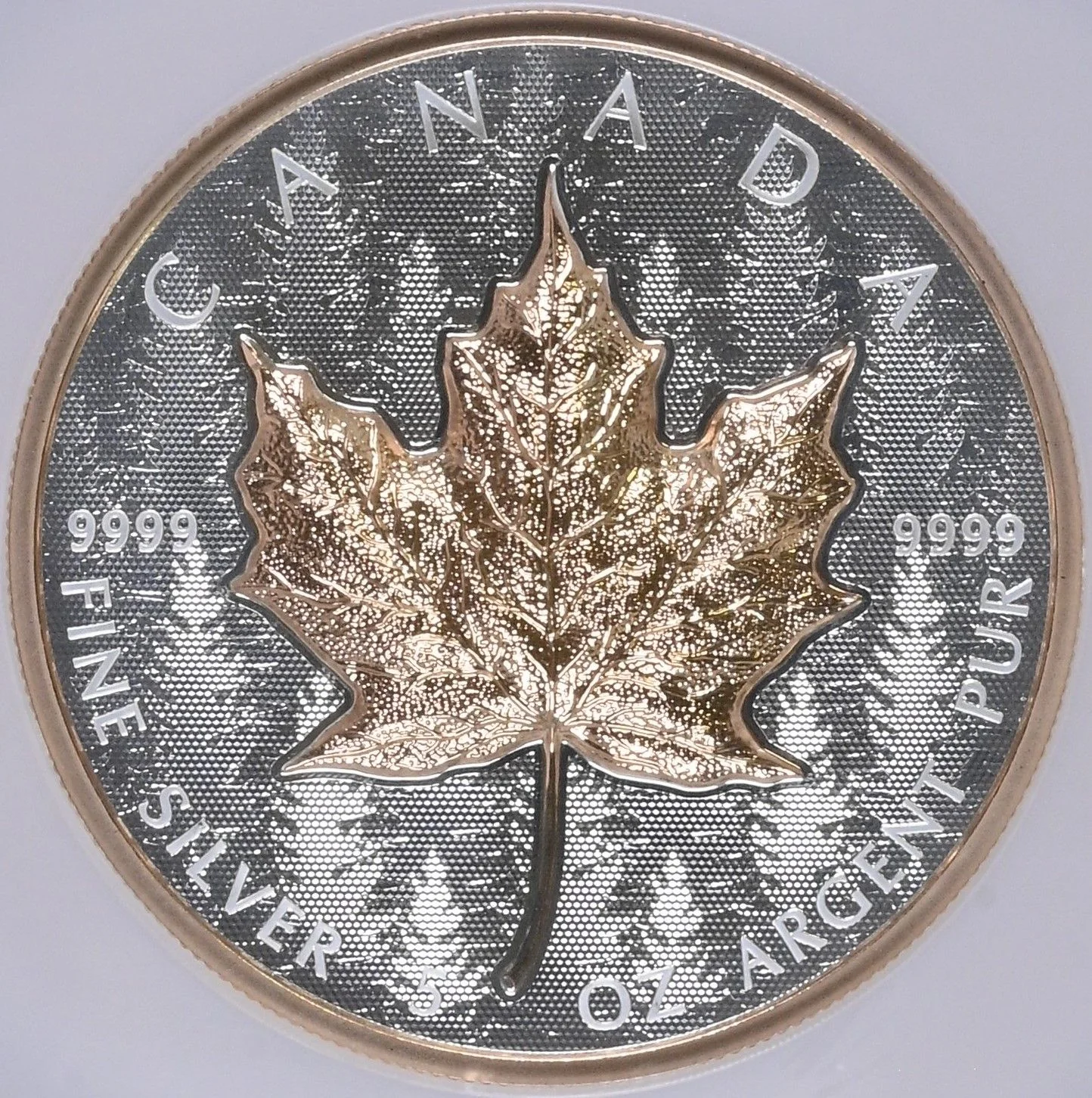 Gilt maple leaf on forest backdrop.