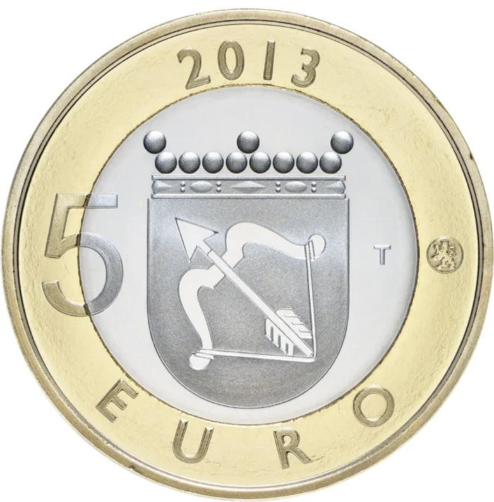 Center: author's "T" and Savonia's bow-and-arrow coat of arms. Upper left: face value "5 EURO". Right: Mint logo. Above coat of arms: year "2013".
