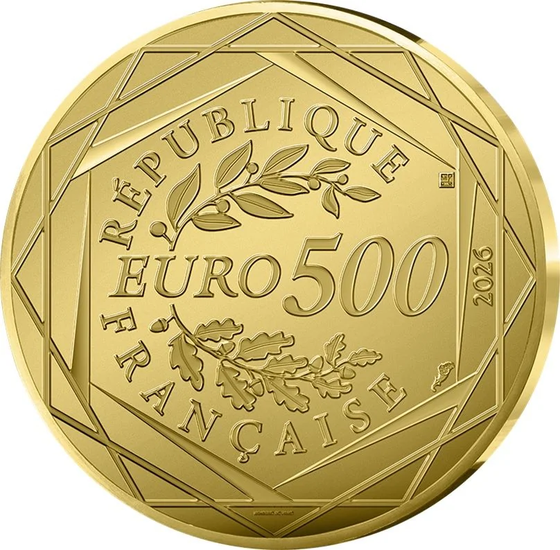 Face value flanked by oak and laurel branches, suggesting the Euro symbol. The design is framed by "RÉPUBLIQUE FRANÇAISE" and lines forming the Hexagon.