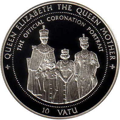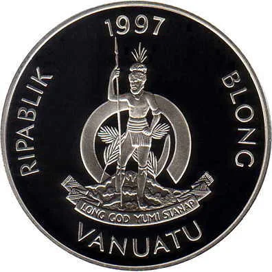 Vanuatu's arms depict a Melanesian warrior before a curved boar's tooth, a scroll reading "LONG GOD YUMI STANAP," and the date.