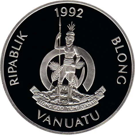Vanuatu's coat of arms depicts a Melanesian warrior before a curved boar's tusk, above a scroll with the national motto.