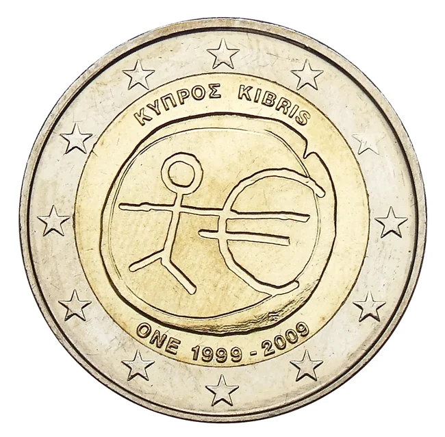 This coin depicts a figure merging with the € symbol, representing the Economic and Monetary Union (EMU) as the latest stage in Europe's economic integration. Issued by each euro area country, it bears the country's name and 'EMU 1999-2009' in its language(s), surrounded by the 12 stars of the EU.