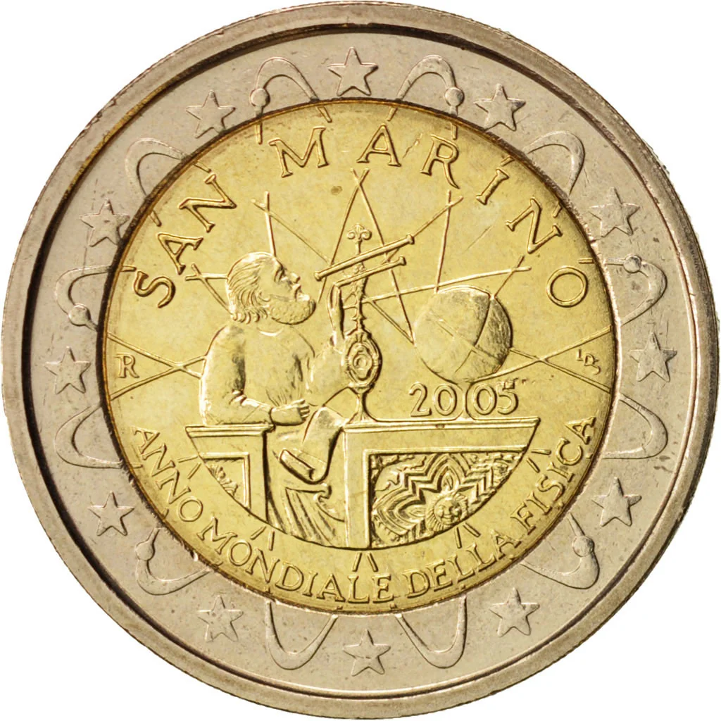 Description: The coin's center freely interprets Galileo's allegorical painting "la fisica antica." The issue year is below a globe on a desk, with the mintmark "R" to the left and the engraver's initials "LDS" to the right. "SAN MARINO" arcs above, and "ANNO MONDIALE DELLA FISICA" runs along the bottom inner edge. The outer ring features the 12 EU stars, interrupted by the lines of a stylized atom spanning the coin's background.