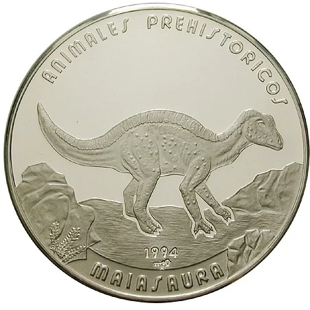 Maiasaura facing right. Event name curved above, animal name below. Mintmark and date beneath image.