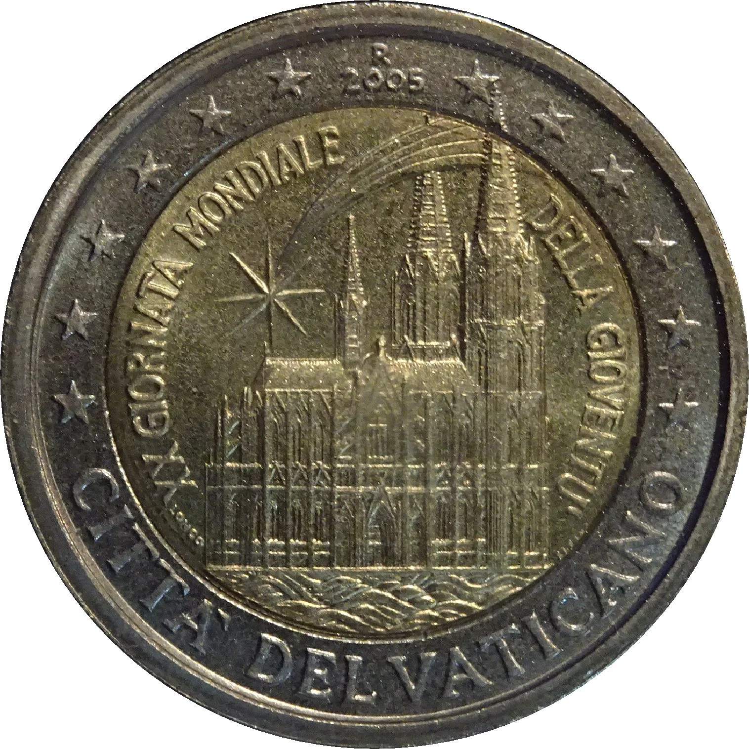 Description: The coin's centre depicts Cologne Cathedral with a passing comet above. "XX GIORNATA MONDIALE DELLA GIOVENTÙ" arches above, interrupted by the comet's tail and two spires. In the outer ring, twelve stars and the year "2005" with mintmark "R" are above, and "CITTÀ DEL VATICANO" curves below.
