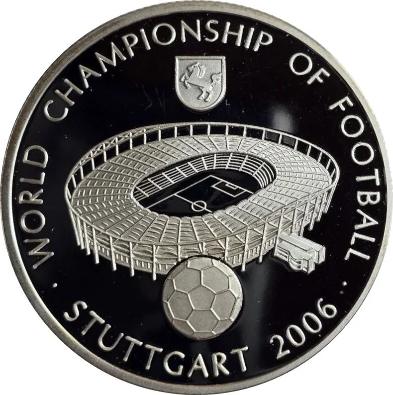 Stuttgart stadium, its coat of arms above a soccer ball.