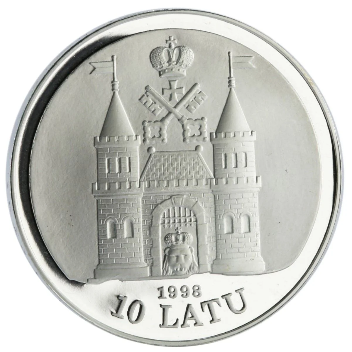 Riga's 19th-century coat of arms, matte-finished for contrast, is featured on the coin. Below it are the year 1998, the numeral 10, and the inscription LATU (lats).