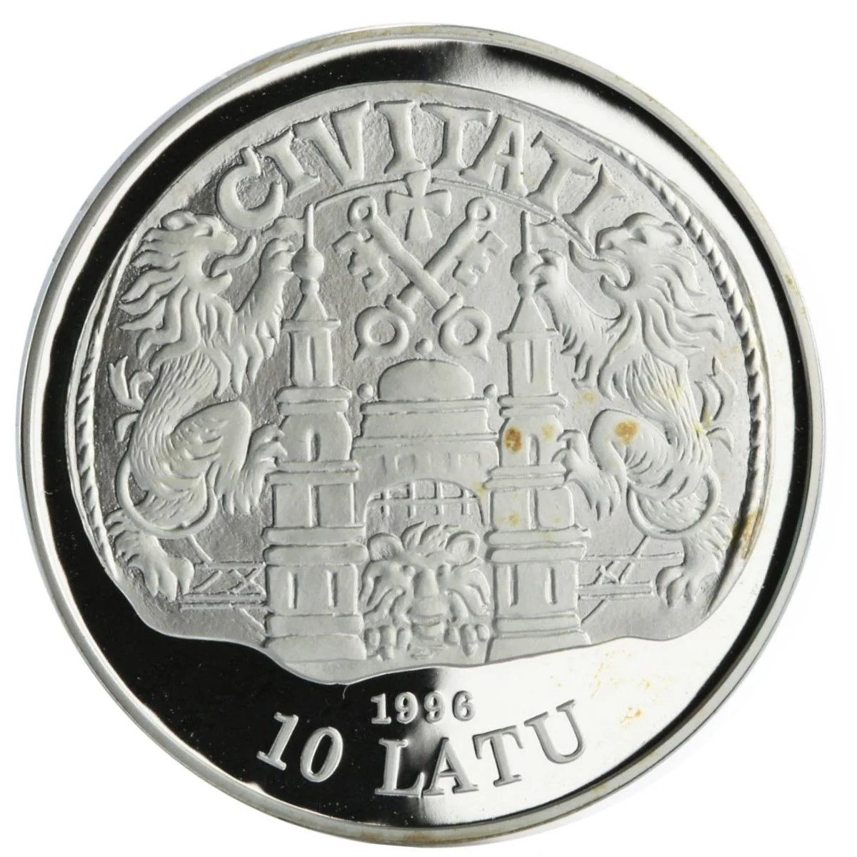 Riga's 16th-century coat of arms, supported by two lions, is matte-finished in the centre, with 1996, the numeral 10, and LATU below.