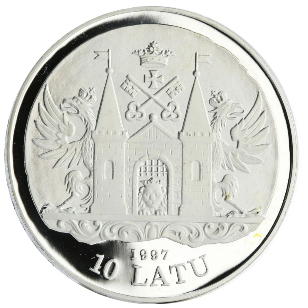 The 1997 10-lats coin features an 18th-century Riga coat of arms, with its shield bearers replaced by a two-headed Russian Imperial eagle, rendered in matte relief.
