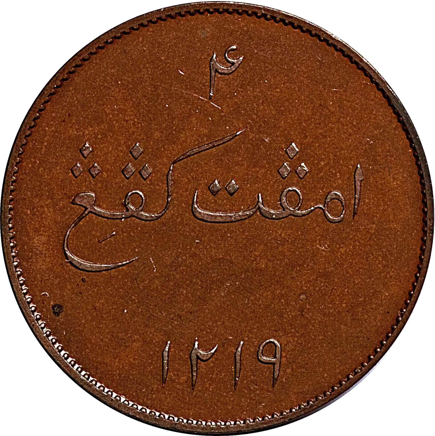 Arabic inscription, denomination above and date below in Eastern numerals, beaded border.
