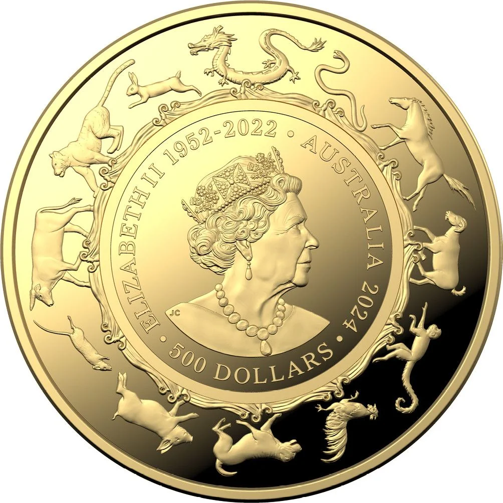 Queen Elizabeth VI crowned portrait facing right, wearing the George IV State Diadem and Victorian Coronation Necklace, encircled by the 12 Chinese Zodiac signs. Memorial obverse.