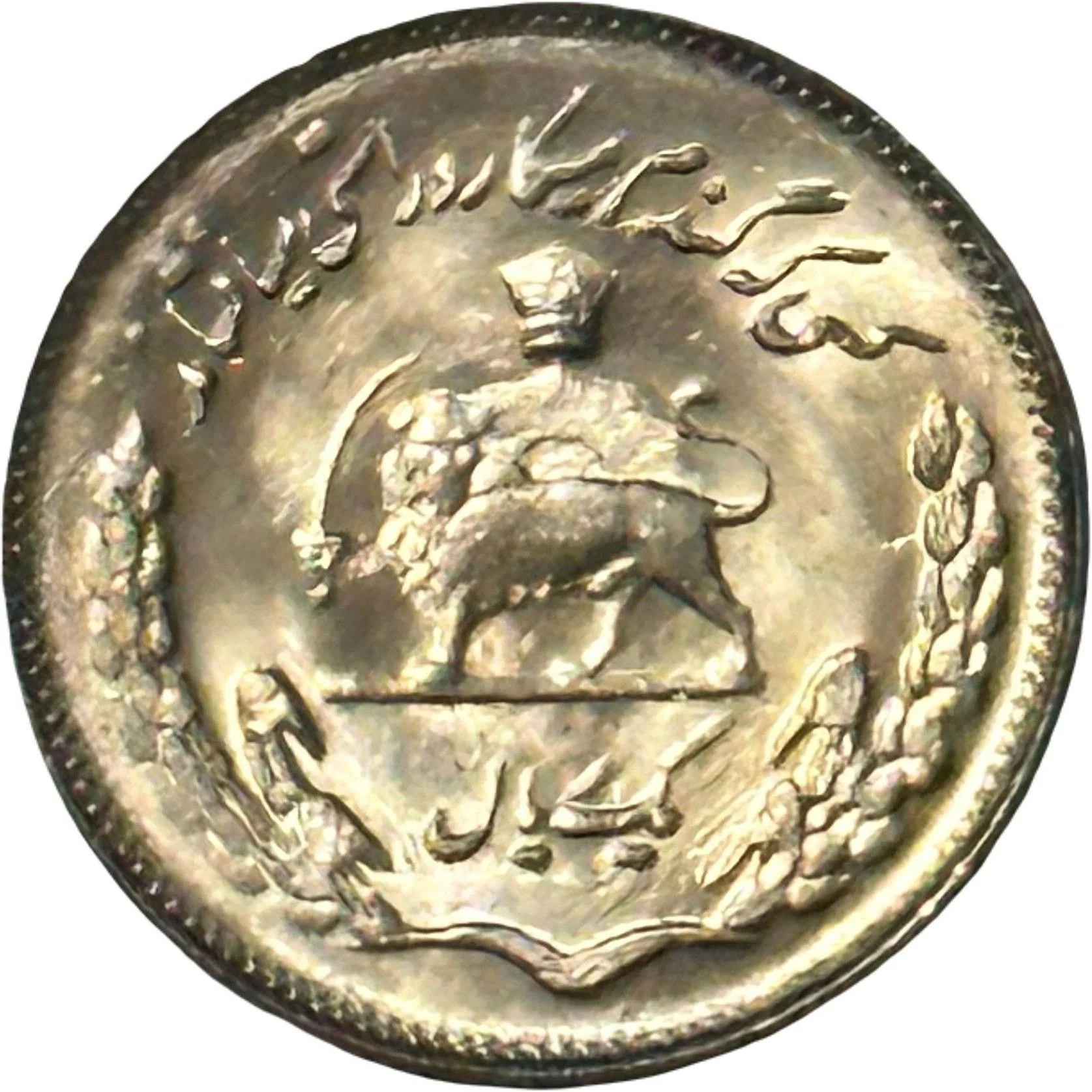 Pahlavi crown with lion and Sun emblem, encircled by wheat.