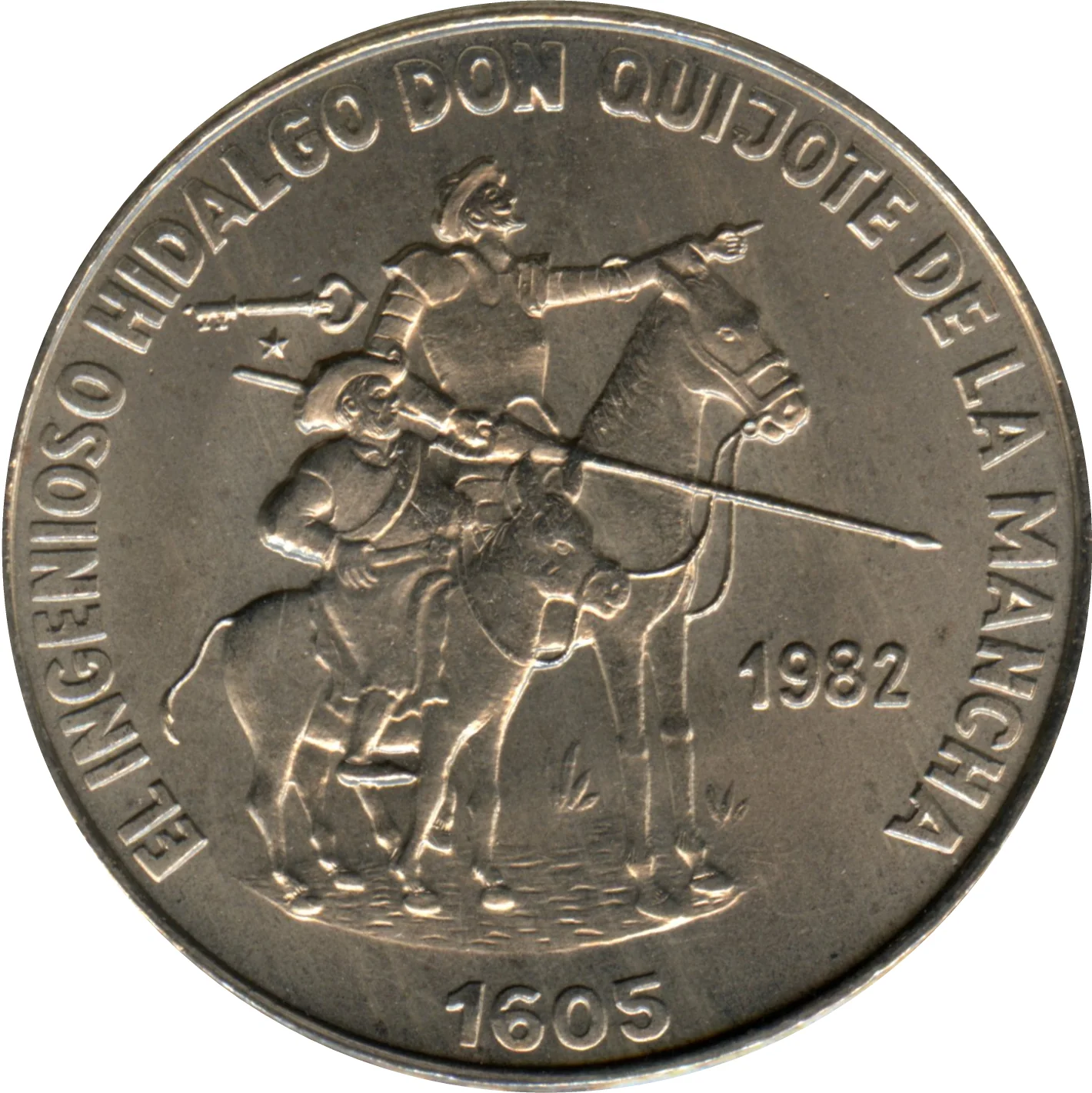 Description: Don Quixote on Rocinante and Sancho Panza on his donkey. Upper left: mintmark. Lower right: issue date. Circular legend: event name above, creation date in exergue.