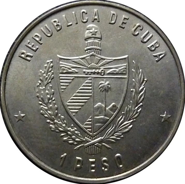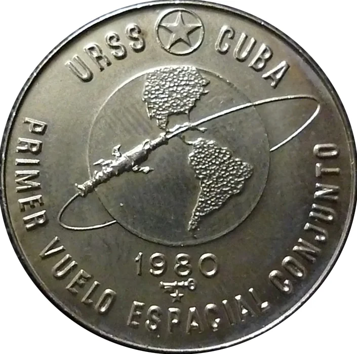 Description: Saliut 6 space station orbiting Earth. Date and mintmark below. Circular legends: country names above, a circled star between them, and the event below.
