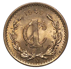 The coin's rim bears "Estados Unidos Mexicanos" above an older coat of arms: a golden eagle on a cactus, devouring a snake, with an oak branch on one side and a laurel on the other.
