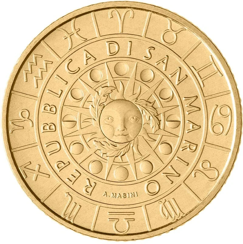 The shared obverse features a central sun surrounded by lunar phases, three feathers symbolizing San Marino, and the twelve astrological signs along the edge.