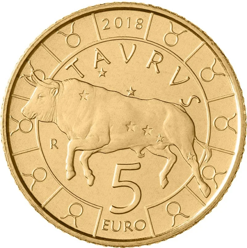 The reverse centers on Taurus, the zodiac's second constellation, with its astrological symbol repeated ten times around the perimeter and the minting year at the top.