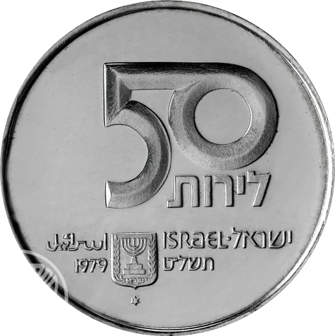 "50 Lirot" in Hebrew. State emblem, "Israel" in three languages, and year "5739-1979".