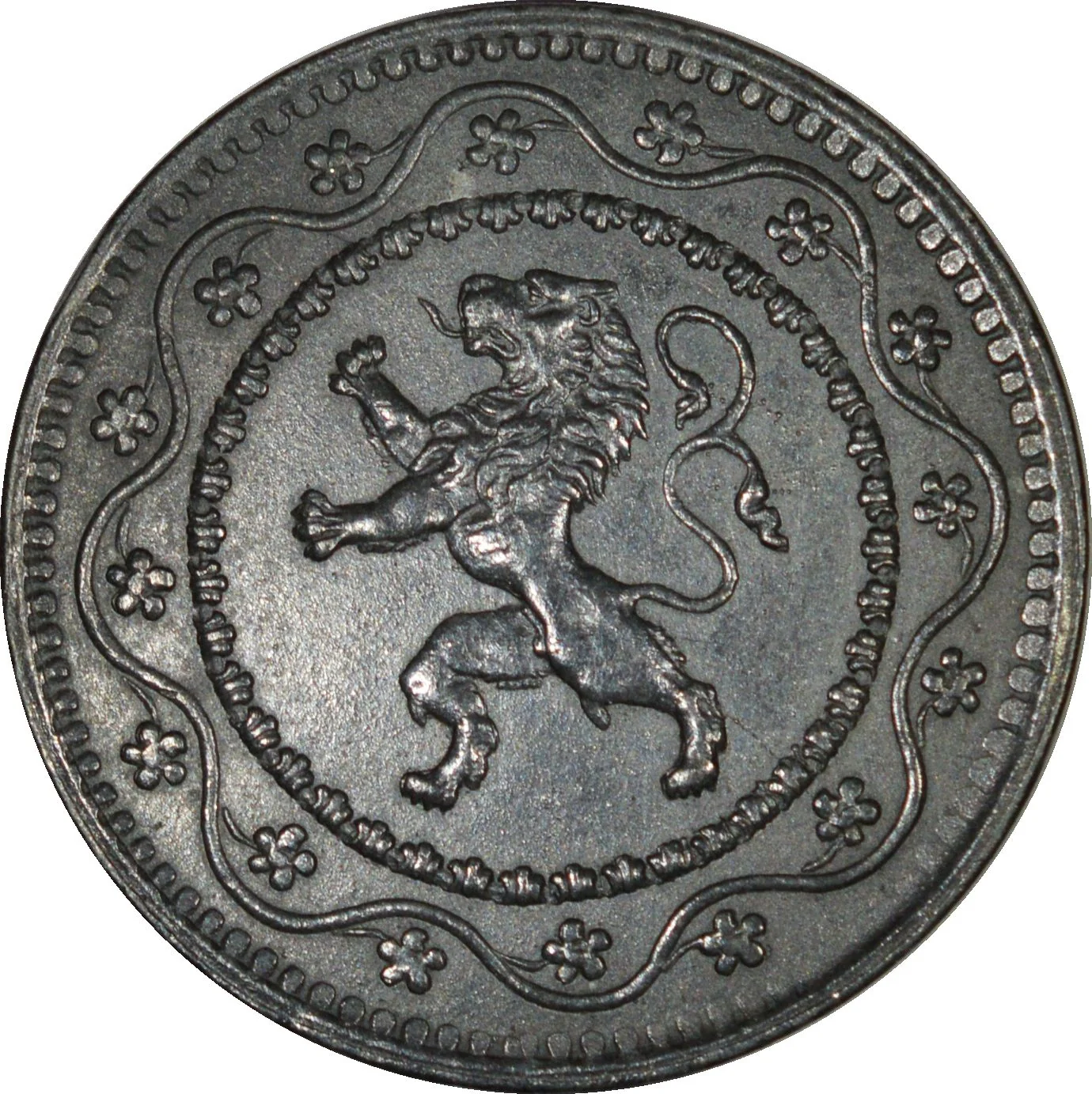 A heraldic lion encircled by a wavy line and sixteen flowers.