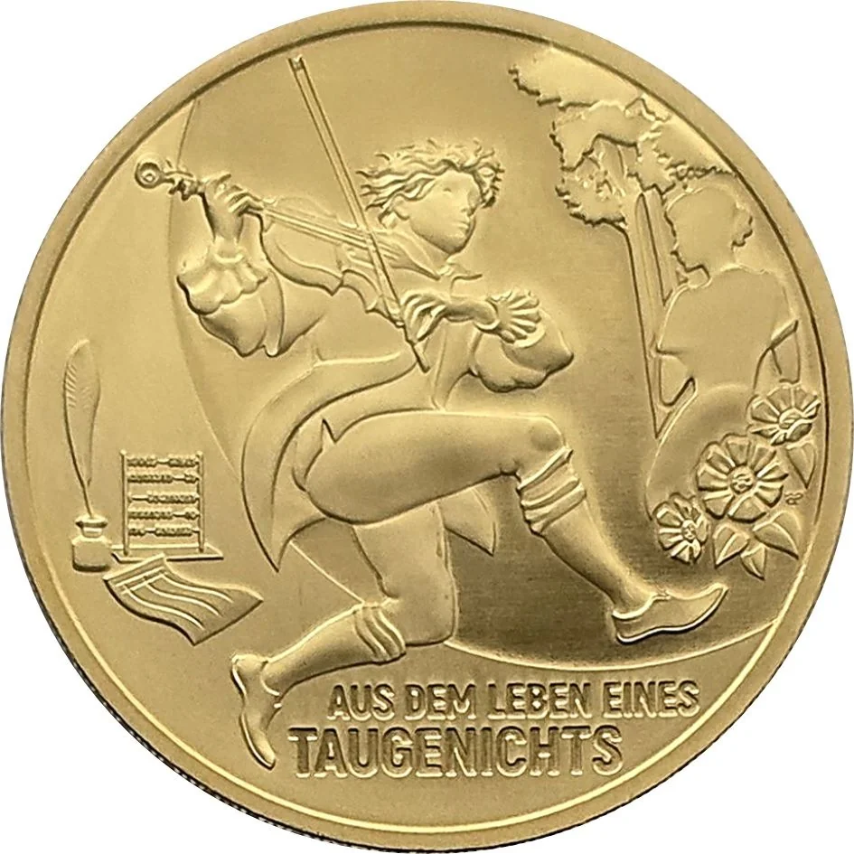 Memories of a Good-for-Nothing: a dry customs office (pen, paper, abacus), a musical protagonist, and a bower with a female figure.