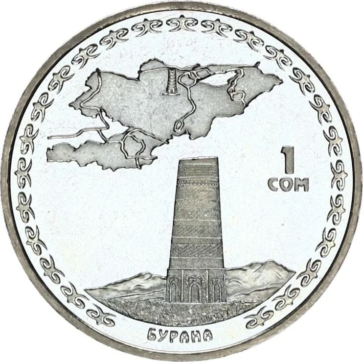 Map of Kyrgyzstan highlighting Burana Tower, with currency denomination and tower view.
