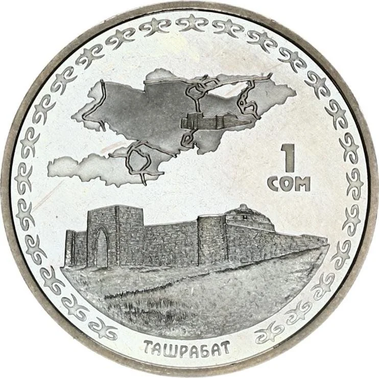Kyrgyzstan map featuring Tashrabat Fortress, its denomination, and a view below.