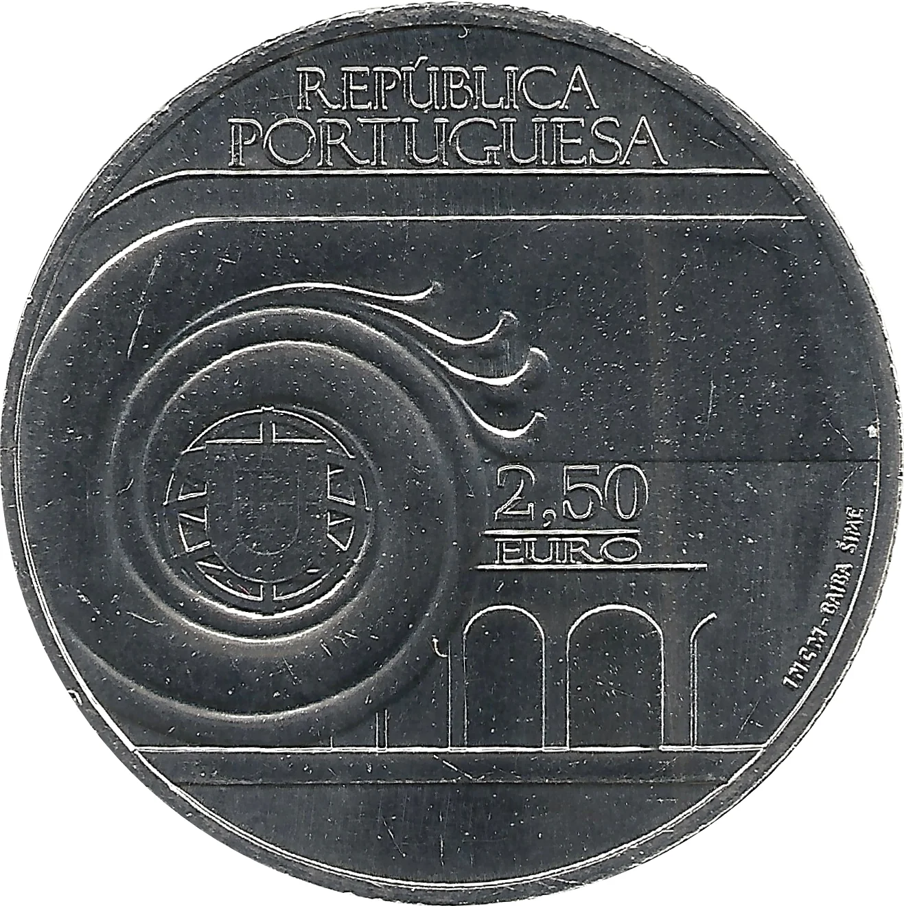 Portugal's coat of arms inside a snail, before old architectural arches.