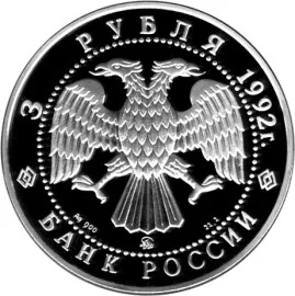 At center: the Bank of Russia emblem (two-headed eagle). Below it, left: metal and fineness; center: mint mark; right: fine weight. Around the rim, top: "3 РУБЛЯ 1992"; bottom: "БАНК РОССИИ", separated by doubled rhombuses.