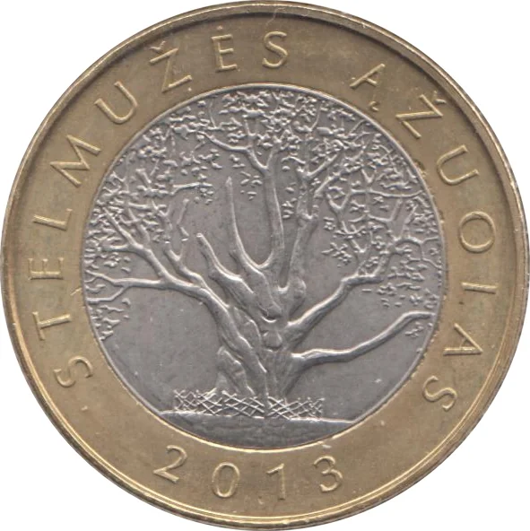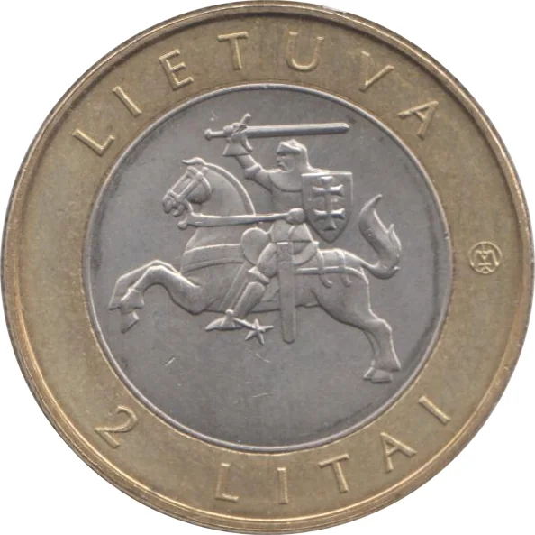 Stylized Vytis emblem with semicircular inscriptions "LIETUVA" and "2 LITAI," plus the Lithuanian Mint mark.