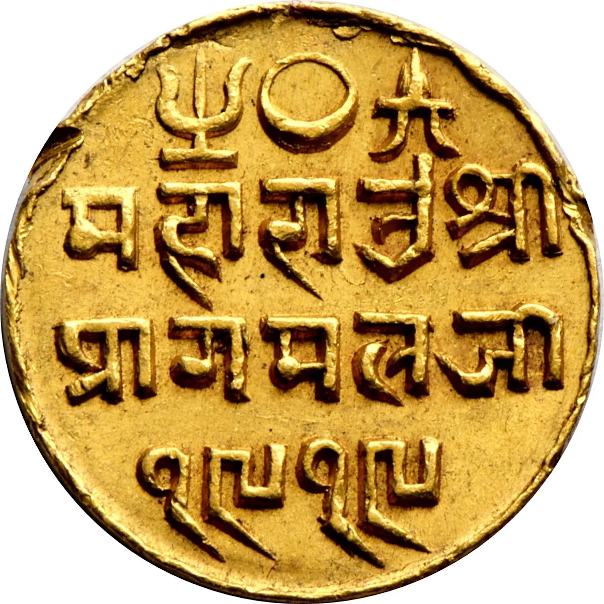 Description: Trident, closed crescent, dagger. Nagari legend: "Maharao Shree Pragmalji" with date in Kutchi numerals below. Y#17.1: closed crescent. Y#17.2: open crescent (only for VS1920/AD1862 and VS1921/AD1863).