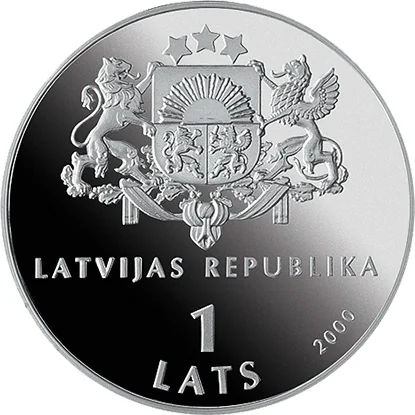 The obverse features the large Latvian coat of arms above the inscription LATVIJAS REPUBLIKA. Below, the numeral 1 is shown with LATS in a semicircle beneath it and the year 2000 to its left.