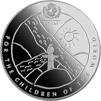 The central motif, a drawing by eleven-year-old Latvian Guna Barbale, depicts a child on a hilltop against a landscape of rivers, hills, and the sun. It is encircled by the text "FOR THE CHILDREN OF THE WORLD" and topped by the UNICEF logo.