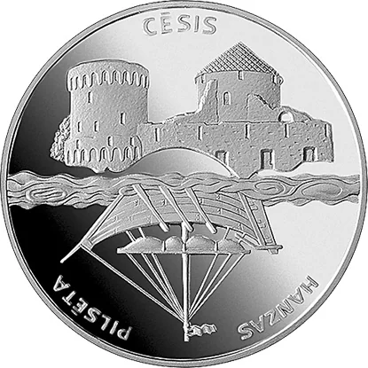 Sea waves divide the coin, with Cesis Castle above and a Hanseatic ship's reflection below. The inscription "HANZAS PILSETA" curves beneath.