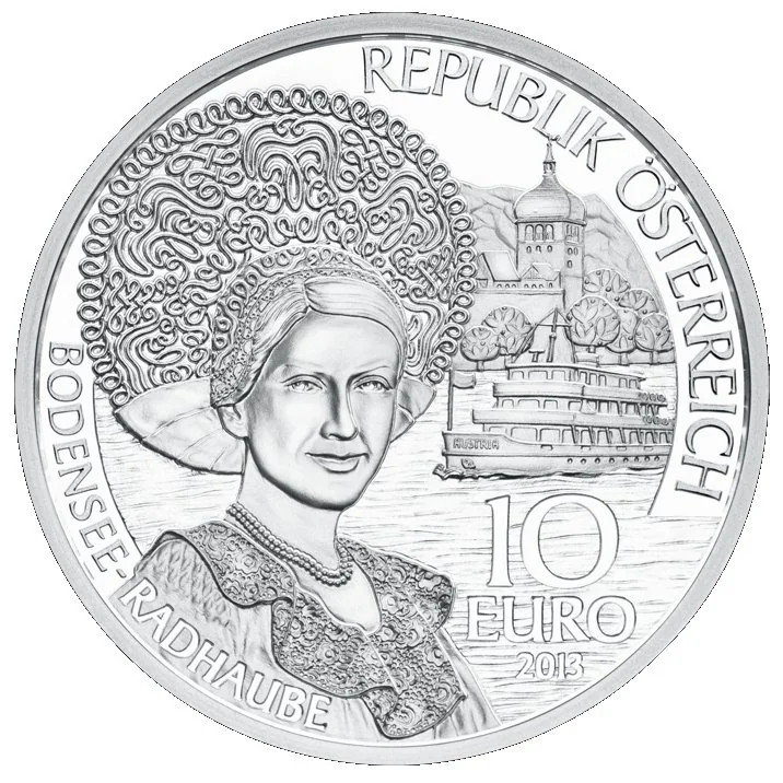 Woman in a "Bodensee-Radhaube" bonnet, with Lake Constance and Bregenz's St. Martin's Tower.