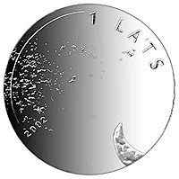 The silver reverse features a frosted waning moon below and a raised constellation above. To the constellation's left is the year 2002, and to its right, the semicircular inscription 1 LATS.