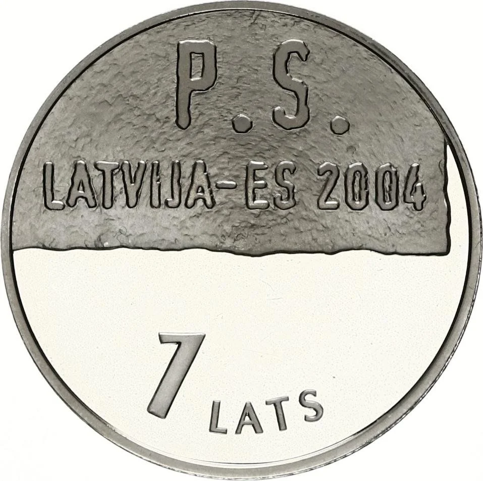 The reverse shows "P.S" slanted on a dull left background, with "LATVIJA - ES 2004" below. On the right, the numeral 1 and "LATS" appear in a semicircle.
