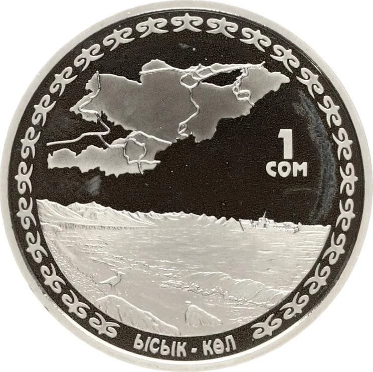 Map of Kyrgyzstan highlighting Lake Issyk-Kul, with its denomination and a view of the lake below.