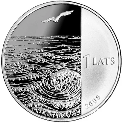 The coin's obverse is vertically split (2:1 ratio). The right side centers "1 LATS" with 2006 arched below, while the left depicts the sea and a flying seagull.