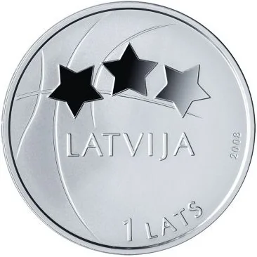 The obverse shows three stars above "LATVIJA" on a basketball, with "2008" arched to the right and "1 LATS" at the bottom right.