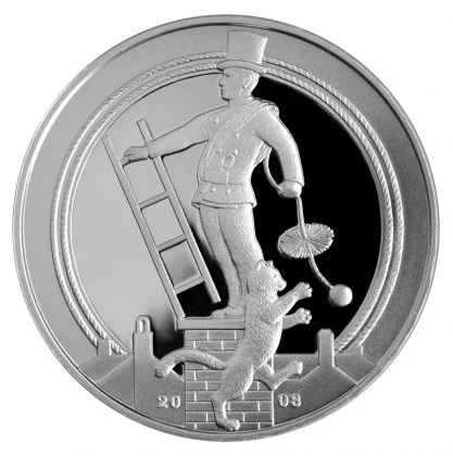 A chimney sweep on a rooftop holds a ladder in his right hand and a rope coil and weighted brush in his left. A cat and the inscription "2008" are below.